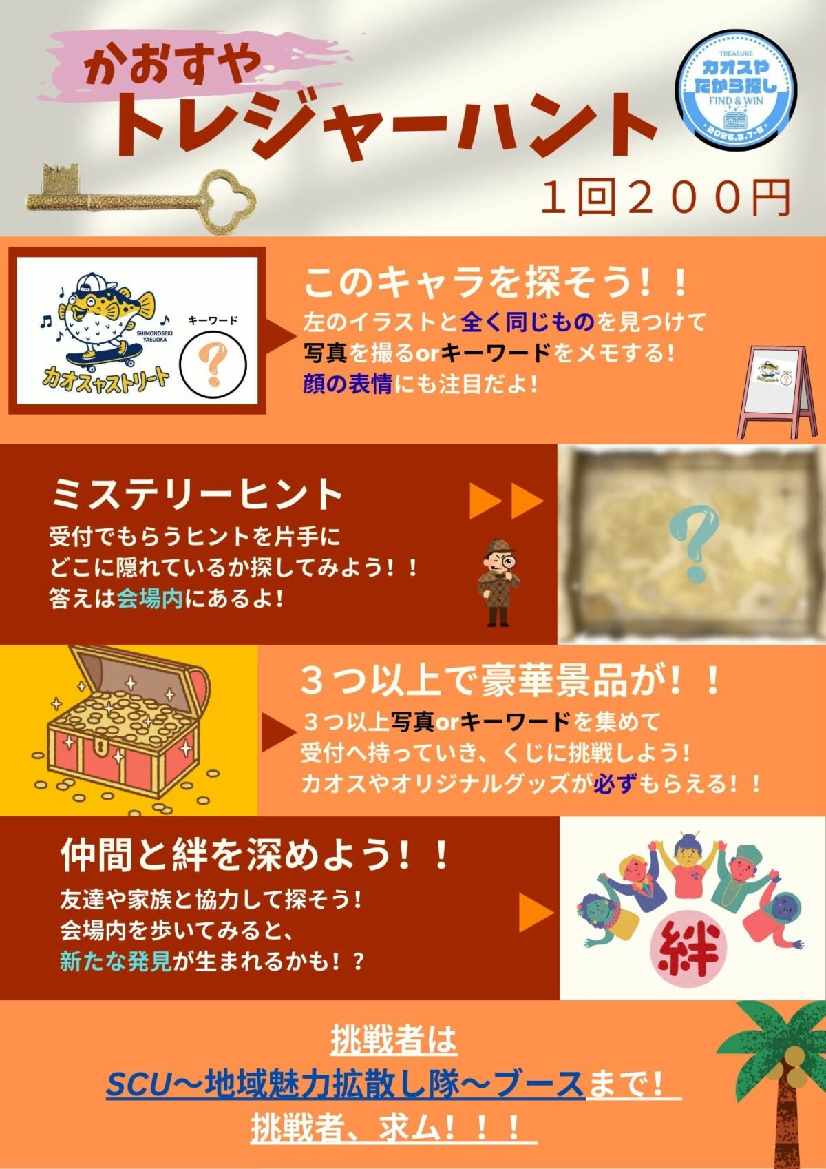 この新企画は、下関市立大学の「SCU~地域の魅力拡散し隊~」の大学生さん企画・運営のキャラクターを探したら、豪華賞品がGETできる、宝探しイベントです。