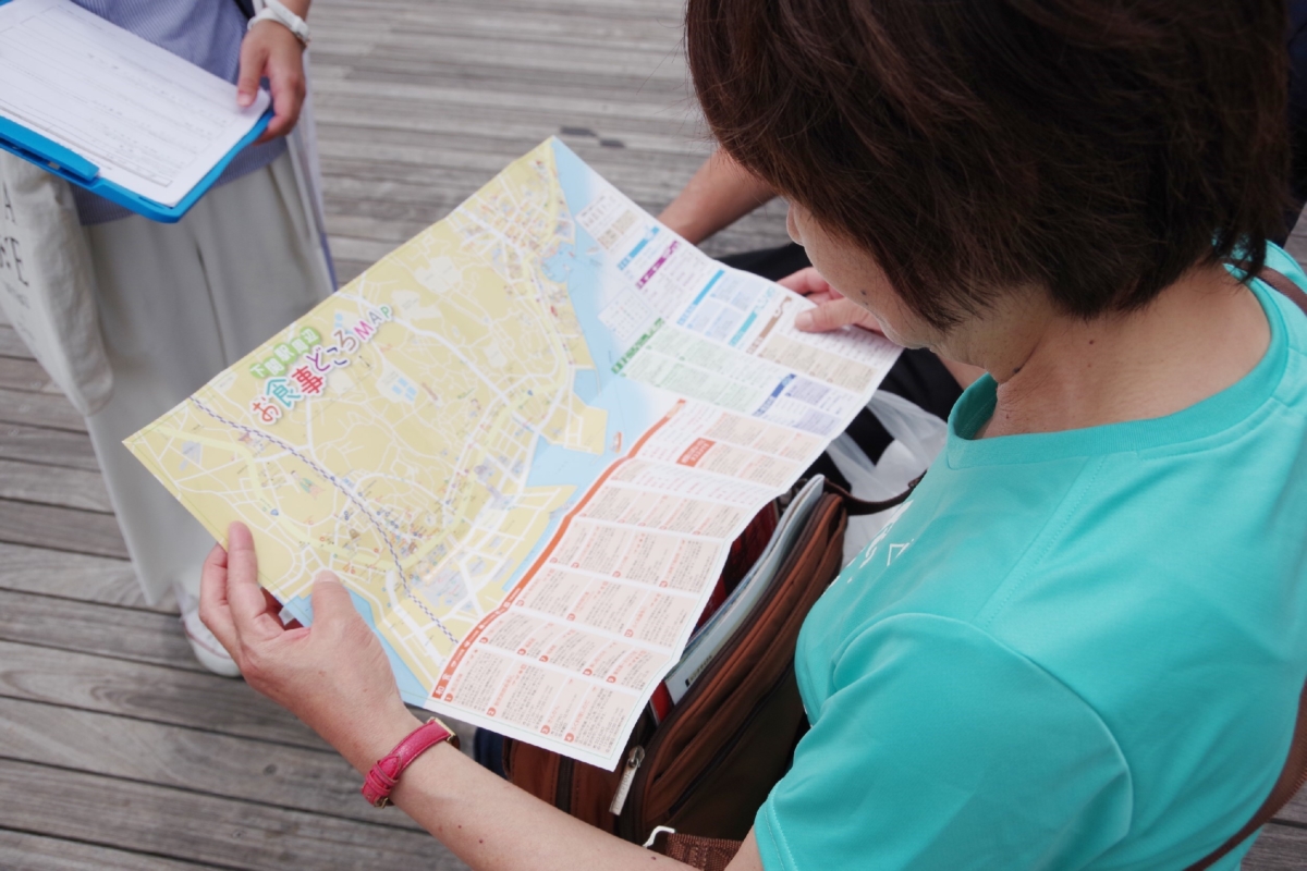 門司港から電車に乗って、バスに乗り換えて唐戸市場まできたよ。駅の案内所で、このマップをもらったよ。この他にもるるぶを持ってるよ。