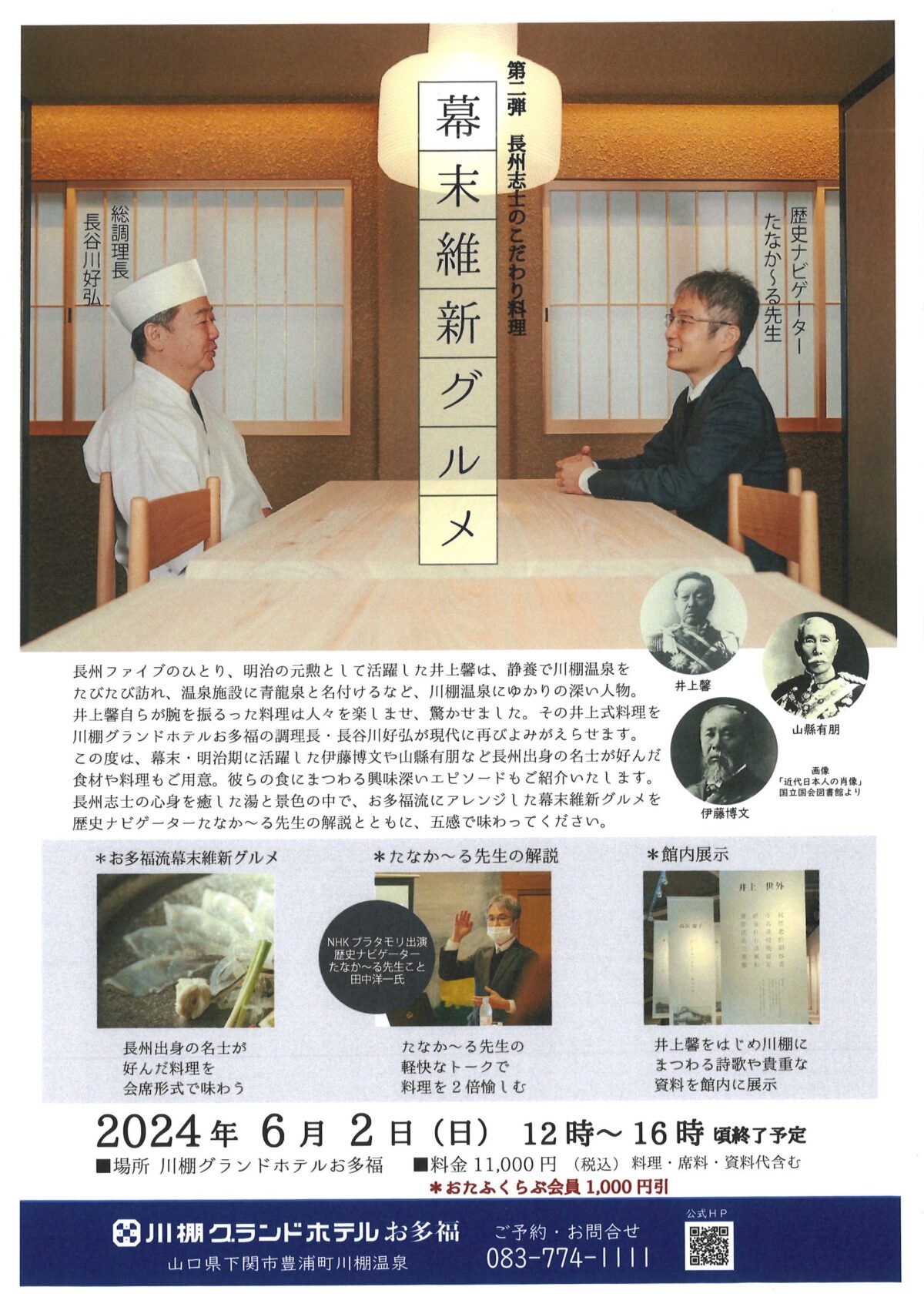 歴史講座や歴史イベントを自ら企画、主催、ラジオやテレビなどメディアでもご活躍中の、たなか~る先生が、川棚グランドホテルお多福さんにて長州ファイブの一人である、「井上馨」に焦点を当てた「幕末維新グルメ」というイベントを企画をされました。