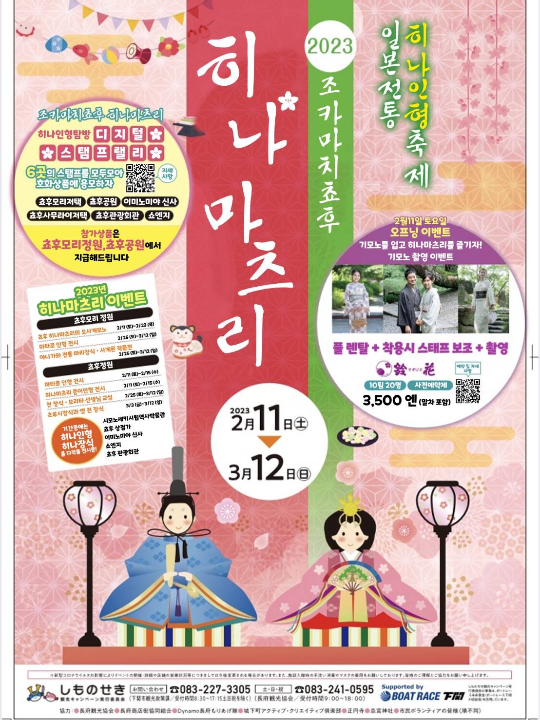 분들이 붐볐다고 합니다. 이 기간 중 에도 모리저택에 5000~6000명의 사람들이 오사게모노를 보러 방문했다고 합니다.이번해는 시모노새키 관광 캠페인 실행위원회가 히나마츠리의 오프닝이벤트로서 [기모노옷 풀 렌탈 +
