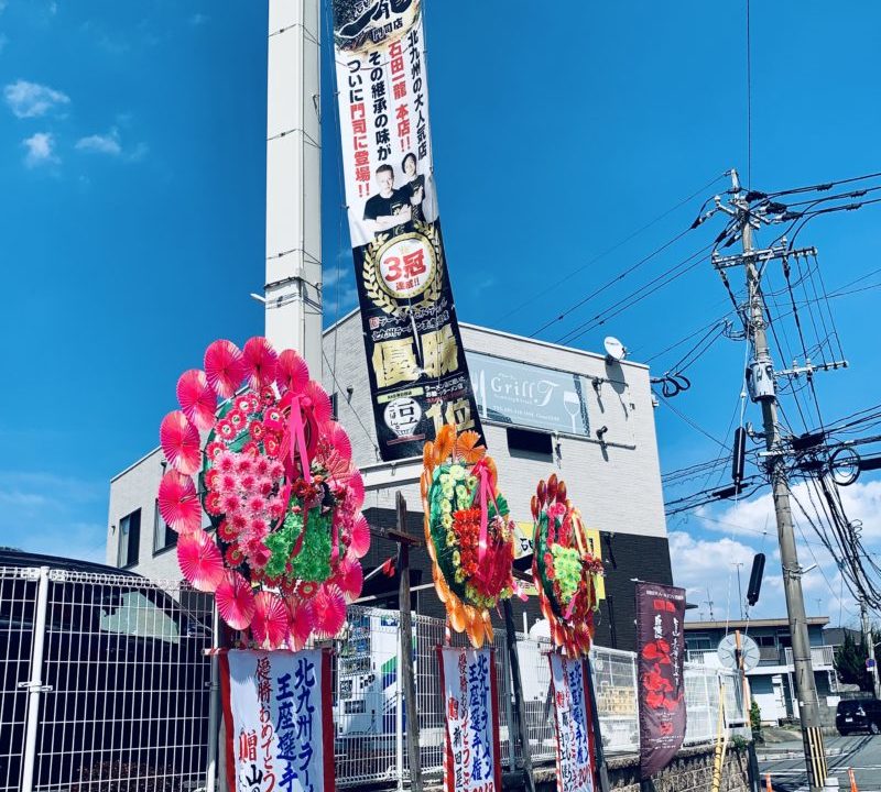 お店の周りの花輪が、ばばばーんっと祝福モード一色です。