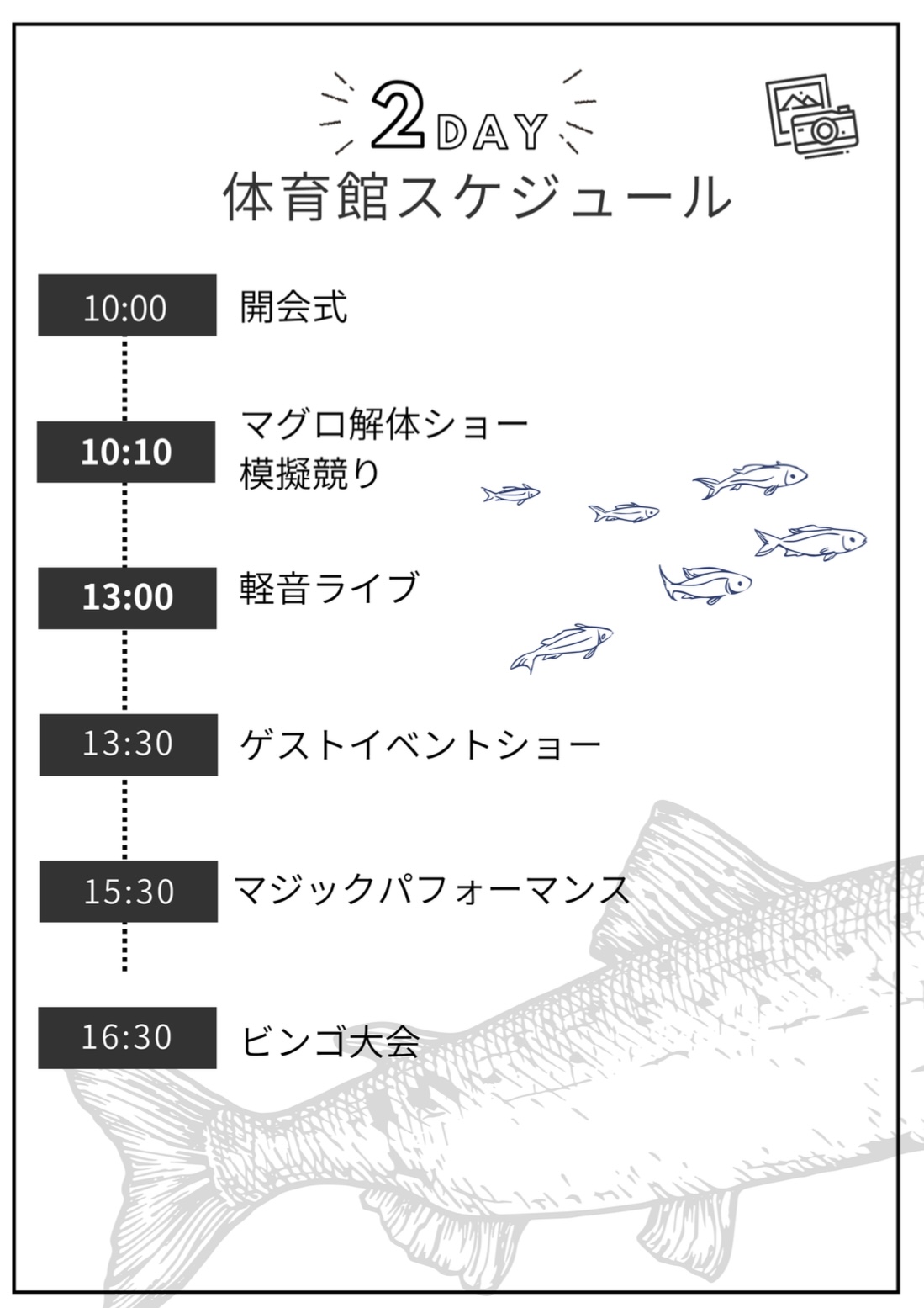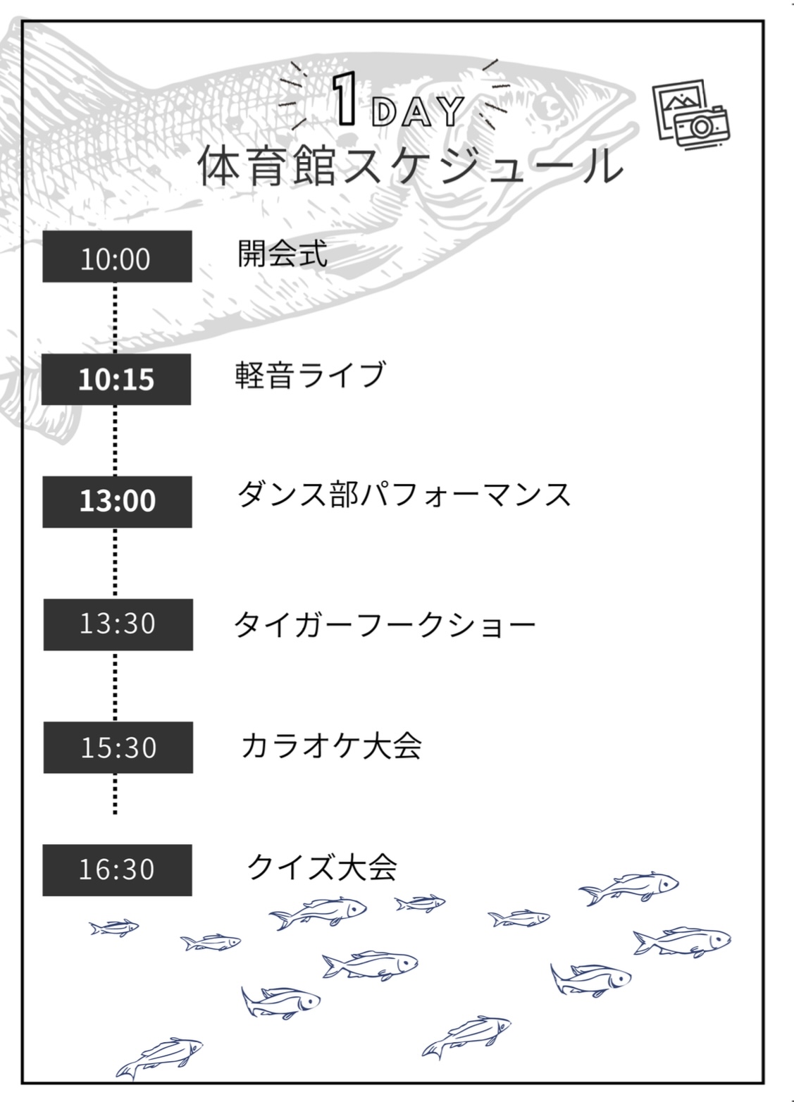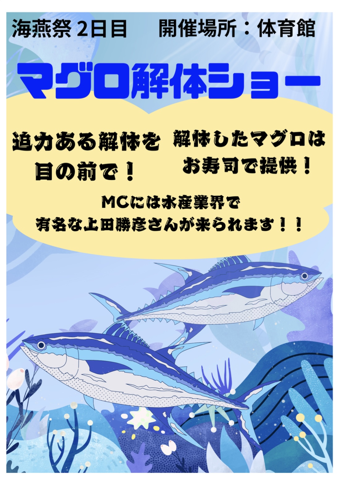 海燕祭中の体育館では、軽音ライブ、ダンス、タイガーフークショー、カラオケ大会、クイズ大会など内容盛りだくさん。2日目には、マグロ解体ショーもあるそうで、見逃せません。
