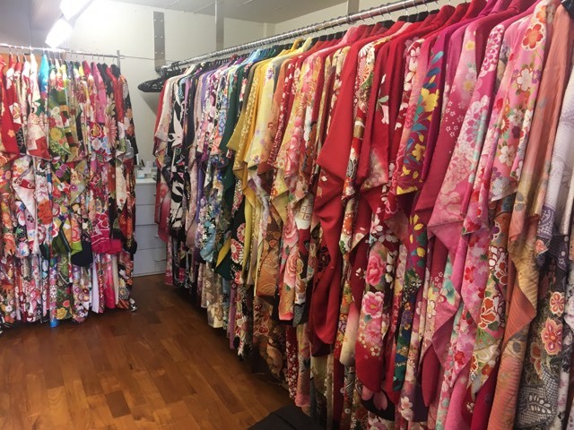 ふぐで有名な春帆楼、安徳天皇が祭られている赤間神宮。源平合戦・壇ノ浦の戦いのあった関門海峡を望む歴史的な場所に、現在三代目が担う「貸衣裳千景店」があります。店内に入ると、ずらりと袴用の着物などが並びます。本当にいろんな種類があって、着物好きにはたまりません! 成人式の振袖、卒業式の袴をはじめ、七五三、そして、結婚式の和装・洋装がレンタルできます。